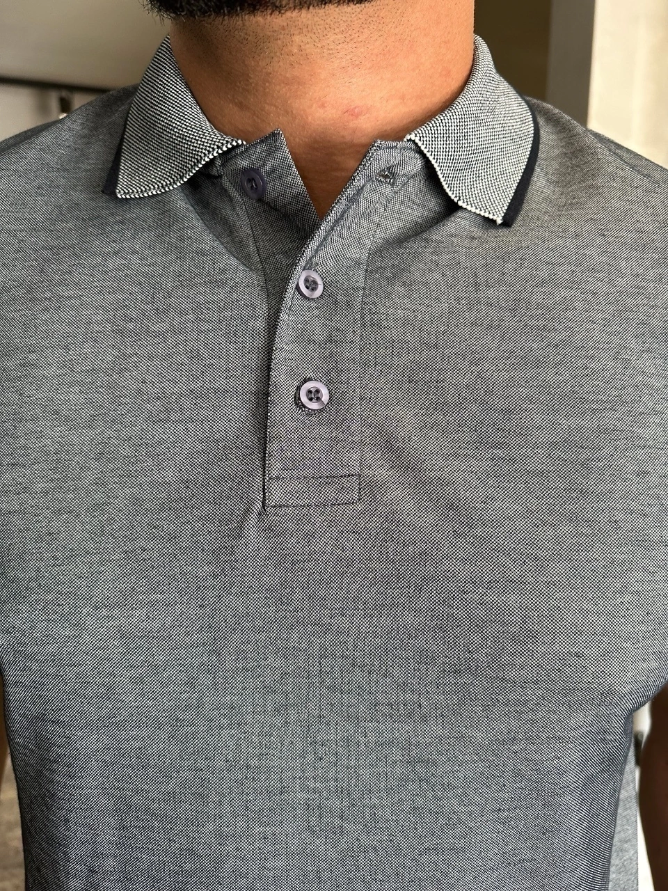 A gola polo é confeccionada em um tecido extremamente leve e fresco, ideal para os dias quentes. O destaque fica por conta dos detalhes na gola, que apresentam um design sutil e elegante, acrescentando um toque de sofisticação à peça. O seu tecido mesclo proporciona um contraste interessante, enquanto garante conforto e flexibilidade. Com um caimento impecável, essa gola polo se adapta perfeitamente ao corpo, oferecendo liberdade de movimentos e um visual moderno, ideal para diversas ocasiões, desde eventos casuais até um dia no escritório.